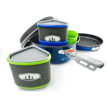 Obtienes una olla de 2 litros, una sartén de 8″, una tapa coladora, dos tazas grandes con mangas aisladas, dos tazones, un par de tapas para sorber , nuestra pinza plegable para ollas y la bolsa soldada para el fregadero.