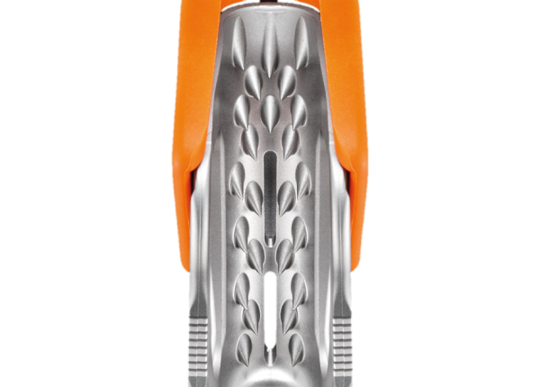 - Leva de acero inoxidable con dientes en ángulo y ranura autolimpiante que sujeta la cuerda de forma segura, incluso en condiciones de barro o hielo