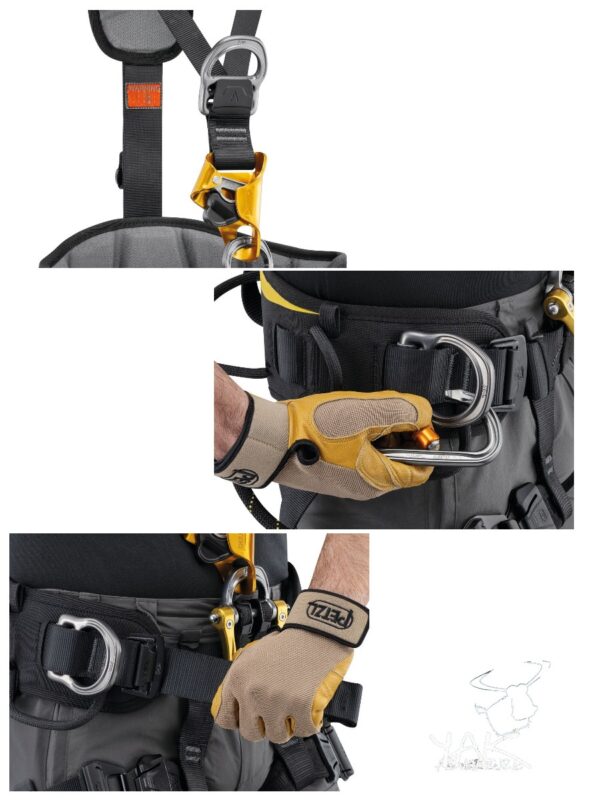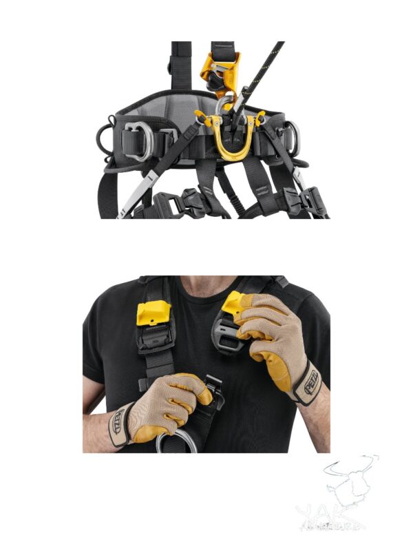 – Los tirantes están equipados con una cinta de Velcro ajustable en altura y posicionable a derecha o a izquierda para sujetar al absorbedor de energía ASAP’SORBER.