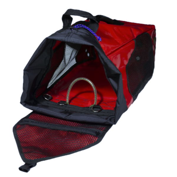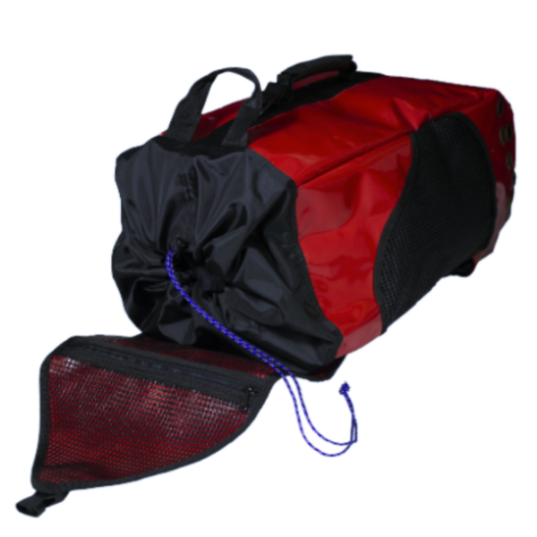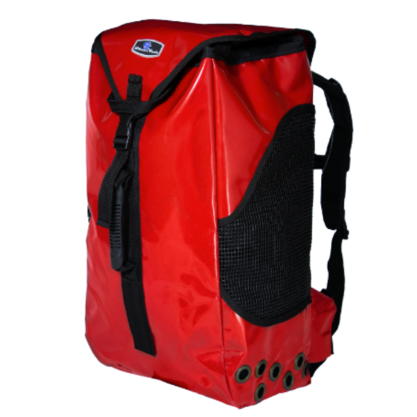 Mochila para cañonismo tipo costal, con cargadores y cinta lumbar, sistema de desagüe en base con ojillos y costados de malla, tapa, bolsa interior, asa frontal.