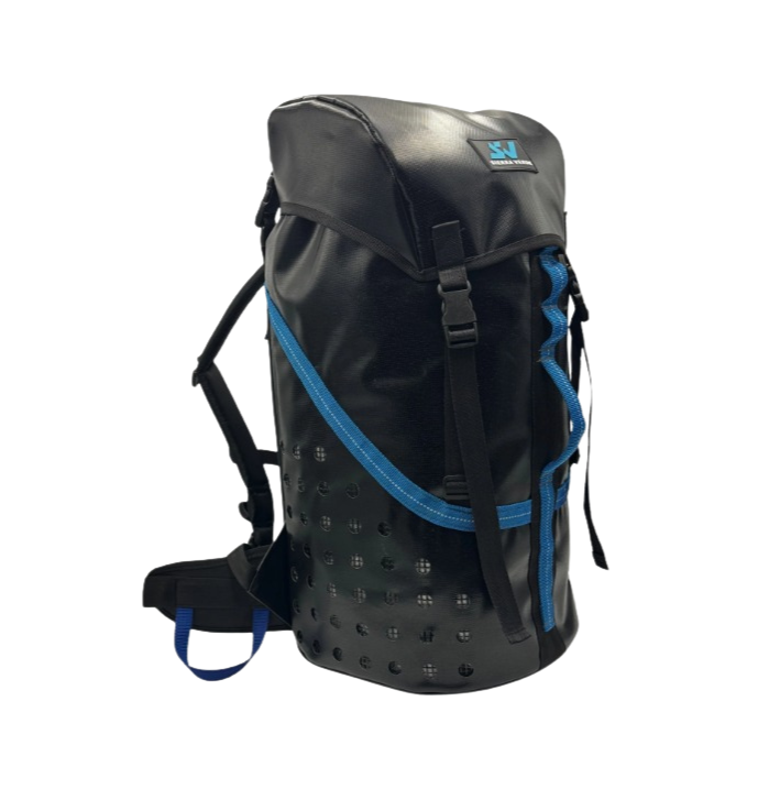 Mochila para cañonismo tipo costal de cerrado con cordino, con cargadores y cinta lumbar, sistema de desagüe en base y costados, tapa y asa frontal de cinta tubular. Malla plástica en el interior. Respaldo con relleno de ½ pulgada de alta densidad.